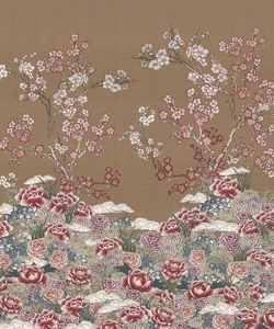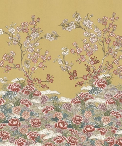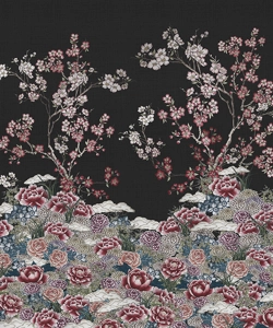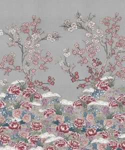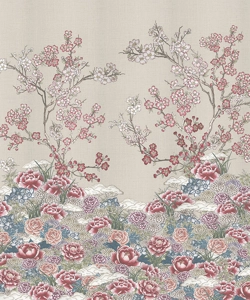 Un tripudio di fiori disegnati a mano, ravviva questo soggetto. Ciliegi, camelie, peonie, cari alla tradizione e dal forte significato simbolico, vivacizzano questo decoro, che trae ispirazione dai disegni delle porte a scorrimento delle case e dai motivi che componevano i kimono tradizionali.